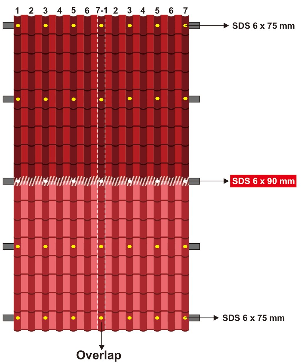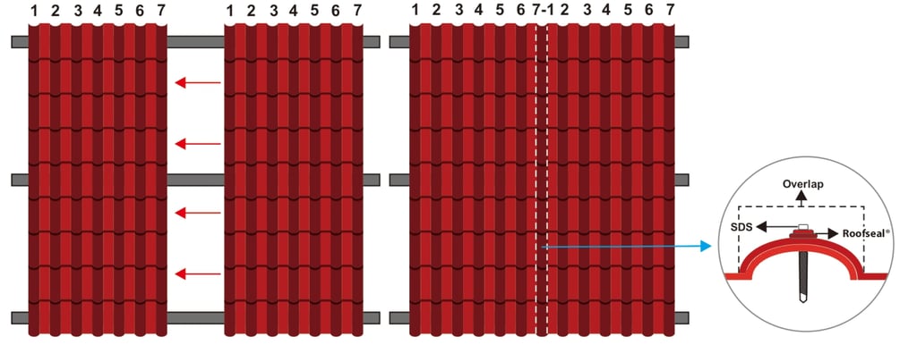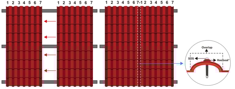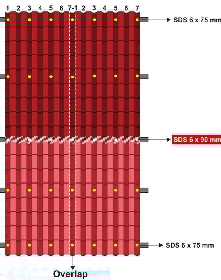 Pasang SDS seperti gambar di bawah ini. (1 M2 membutuhkan 6 SDS & 6 Roofseal).